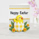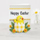 This card shows a vertical spring scene with a round, bright yellow little bird peeking up from a cracked eggshell, its wide eyes and rosy cheeks giving it a sweet, friendly look 🐰. The bird’s orange beak sits above the lower half of the shell, which is decorated in a yellow-and-white gingham pattern that feels cozy and homespun. Around the shell, layered green leaves curl inward as if they’re gently sheltering the new arrival, like friends gathering close for a welcome. Small yellow flowers with warm orange centers are tucked between the leaves, adding soft pops of color that echo the bird’s sunny tone 🌷. Near the top, a white banner stretches across with “Happy Easter” centered in dark lettering for easy reading. The banner edges are scalloped and trimmed with alternating orange and yellow triangle accents that frame the words. Behind everything, a pale background carries a faint geometric lattice pattern that stays subtle while the raised-looking leaves and blossoms stand out in front.