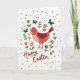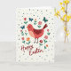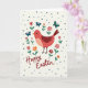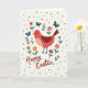 This design shows a plump, stylized bird in warm coral and deep red, dotted with small white spots across its wings and belly for a cozy, affectionate look. A gentle dark eye and bright orange beak give it a soft, friendly expression, as if it’s pausing to admire someone nearby. The bird stands inside a circular wreath of spring flowers in soft pinks, sunny oranges, and deeper reds, all lifted on thin green stems that lean inward like they’re sharing a quiet moment. Three butterflies in deep teal flutter around the blooms, adding a light sense of movement and a touch of togetherness 🌷. The background is a creamy off-white with faint texture, sprinkled with scattered blue circles that echo the bird’s dotted pattern. Near the bottom, a short Easter greeting sits centered in warm red lettering, placed beneath the floral circle for balance 🐰. The teal butterflies hover just above the top-right and upper edges of the flower ring, their wings angled as if mid-flutter.