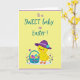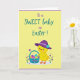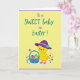 This greeting card features a bright yellow baby bird with rosy cheeks and dark, shiny eyes, standing in a soft springlike glow and giving a gentle, friendly look that suggests closeness. The bird wears a deep purple wide-brim hat topped with a small light blue flower, adding a sweet dressy touch. To one side sits a teal basket tied with a pink ribbon and bow, filled with patterned eggs in purple, orange, and blue 🐰. A short holiday message is placed near the top, set in purple lettering against the pale background for easy reading. Small purple blossoms and tiny dotted accents scatter across the lower area, adding a light, affectionate feel without crowding the scene 🌷. Lavender dotted borders run along the top and bottom edges, framing the illustration like a soft decorative trim. Near the bottom, the bird and basket rest on a subtle white base with a few purple flowers clustered close by.