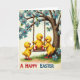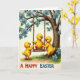 This card shows three plump yellow little birds enjoying a spring day beneath a large tree dotted with blue blossoms and fresh green leaves 🌷. One bird sits on a rope swing, and its two companions stand close by, leaning in as they give a gentle push, like close friends sharing a sweet moment. Their round bodies, dark shiny eyes, and small red beaks are drawn with an affectionate touch, and the swinger’s red feet stand out against the softer colors. A sturdy tree trunk on the right anchors the scene while branches sweep across the top and left, framing the action like a cozy nook. Soft, hazy light falls over pale pastels, with green grass below and cool blue flowers adding contrast to the warm yellows 🐰. At the bottom, the words “A HAPPY EASTER” sit centered in uppercase lettering, set in a dark ink that’s easy to spot against the light background. The swing ropes show braided texture, the bark has fine grain lines, and the blue flowers have tiny pink centers scattered around the canopy.