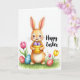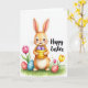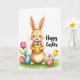 This design shows a sweet, human-like bunny 🐰 centered on a white background, with tawny fur, rosy cheeks, and bright eyes that seem to glance up with friendly affection. A tiny pink tongue peeks from its smile, and fine whiskers fan out as it holds a golden woven basket close to its chest like a small gift meant for someone special. Inside the basket sit two glossy purple eggs, while more decorated eggs rest in the grass below with red and blue stripes. A band of lush green grass stretches along the bottom, sprinkled with lighter green dots that suggest new spring growth. On either side of the bunny, a pink tulip and a yellow tulip rise upright, their open petals adding a gentle, romantic garden touch 🌷. Near the top, the words “Happy Easter” appear in flowing lettering, set in a soft gray tone against the white space. The bunny stands just above the grassy base, framed by the tulips and scattered eggs.