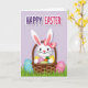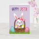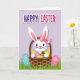 This greeting card features a polished digital illustration of a white bunny with big, shining eyes, a rosy nose, and a pink bow, peeking from behind a woven brown basket 🐰. The bunny’s gentle, curious gaze adds a sweet, friendly tone, like it’s sharing a small secret with the viewer. The basket is packed with decorated eggs in bright colors, showing patterns like dots, hearts, and sunburst shapes, with a single orange carrot tucked among them 🐇. A soft lavender background keeps the scene calm while letting the basket and eggs stand out. Along the lower edge, a strip of green grass suggests an outdoor spring setting where friends might wander together, shoulder to shoulder, looking for hidden treats. Near the top, the words “HAPPY EASTER” sit centered, with “HAPPY” in deep purple and “EASTER” in pink, both outlined in white for a layered look. Soft shading gives the bunny, basket, and eggs a gentle sense of depth against the pastel backdrop. The basket’s braided texture and the egg patterns are crisp, with the carrot’s leafy top peeking up near the rim.