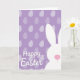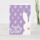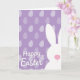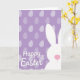 This greeting card features a soft lavender background sprinkled with many pale, semi-transparent oval shapes that resemble scattered spring eggs. On the right side, a large white bunny 🐰 is cropped so you mainly see its tall ears and the top of its head, as if it’s leaning in to say hello. A tiny pink nose and a few fine whiskers add a gentle, friendly expression that feels a bit like a shy crush or a close friend checking in. The lighting stays smooth and airy, keeping the scene calm and tender. In the lower-left area, the words “Happy Easter” appear in flowing white lettering that curves lightly across the space. The white text balances the bunny’s bright shape, while the pink nose ties in a small touch of warmth. Pale violet, white, and soft pink work together so the bunny stands out without harsh contrast 🌷. The background ovals vary in size and spacing, floating across the lavender field behind the bunny’s ears.