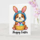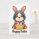 This greeting card shows a small brown-and-white puppy-like character sitting against a white background, dressed in a bright blue hood with tall bunny-style ears lined in pink 🐰. Its wide eyes and gentle smile give it a sweet, friendly look, like it’s waiting to share the moment with someone close. The character cradles a golden wicker basket in its лапs, held carefully as if it’s a thoughtful gift. Inside are decorated eggs in pink, purple, and teal, with stripes and swirls that add lively color to the simple scene 🌷. Soft shading rounds out the fur, the hood folds, and the basket weave, keeping everything smooth and cozy. Near the bottom, the words “Happy Easter” appear centered in a flowing, dark-colored lettering that stands out clearly on the white space. The pink-lined ears rise above the hood, framing the character’s face while the basket rests in front, brimming with patterned eggs.