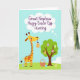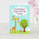 This design shows a tall, spotted, long‑necked animal on the left, colored sunny yellow with warm orange and brown markings, leaning in with a tender, friendly look as it holds a striped pastel egg gently in its mouth 🐰. On the right stands a stylized tree with a sturdy brown trunk and a rounded green canopy, creating a cozy gathering spot. Across the bright green grass and hanging from the branches are many decorated eggs, featuring dots, swirls, and stripes in soft lavender, coral, and light blue. A woven basket sits at the base of the tree, tipped slightly open and filled with more patterned eggs, as if they’ve been collected together. Near the top, a white thought bubble contains the greeting text in purple, placed centrally so it floats above the scene. The flat, airy shapes and soft colors give the picture a gentle springtime mood, like two friends sharing a quiet moment during an egg hunt 🌷. The eggs are spaced in a loose trail from the basket outward, and a few hang at different heights from the tree’s branches.