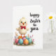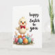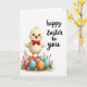 This card features a pale yellow baby bird with fluffy feathers and big blue eyes, standing tall as if posing for a friend, with rosy cheeks and a small red bow tie that adds a sweet, dressed-up touch. The background stays bright white, letting the soft spring colors feel airy and fresh. Beneath the bird sits a stack of pastel eggs in aqua, lavender, peach, and rosy pink, each dotted with tiny white circles that look like confetti. The eggs rest in green grass sprinkled with little pink and purple flowers 🌷, and a few thin leafy sprigs frame the base like a garden border. Off to the right, a seasonal greeting appears in flowing black lettering, placed with plenty of open space around it. The bird’s gentle, forward-facing gaze and the tidy bow tie give the scene a cozy, affectionate mood, like it’s ready to be shared with someone close 🐰. A soft highlight glints along the curved sides of the eggs while the blossoms peek out between blades of grass.