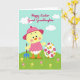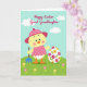Designed with a sweet spring scene, the front shows a round yellow chick character in a pink dress with white polka dots and a matching wide-brim hat, standing in gentle light with rosy cheeks and big friendly eyes. The chick holds a small blue garden tool loosely at its side, as if pausing mid-task to share a tender, companionable moment with the viewer 🐰. To the right sits a large white decorative egg, nearly as tall as the character, decorated with pink and yellow flowers and soft green leaves that curl around the surface. The ground is a sloping green hill sprinkled with small pastel blossoms, adding a soft, romantic garden feel 🌷. Near the top, a festive greeting appears in magenta cursive-style lettering, centered above the figures against the open sky. The sky is pale aqua and airy, giving the whole layout plenty of breathing room around the characters. Three rounded white clouds float across the upper background above the greeting text.