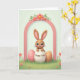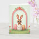 This card features a sweet spring scene with a soft brown bunny peeking from behind a large white decorative egg 🐰. The bunny’s long ears and bright blue eyes lean forward as if sharing a shy hello, with rosy cheeks that add a gentle, friendly warmth. A blush-pink arch rises behind like a garden doorway, topped with clusters of pink blossoms and leafy green sprigs that frame the bunny like a tender backdrop. Across the front of the white egg, the words “Happy Easter” sit centered in medium-pink lettering, easy to read against the pale surface. In the grass below, a bright green lawn spreads out with small pink flowers scattered around, like little notes of affection tucked into the scene 🌷. Two more eggs sit nearby—one a soft rose shade with faint patterning, and the other a warm terracotta tone with a lightly textured look—adding cozy balance on either side. The lighting stays soft and diffused, with gentle shading along the arch, eggs, and fur to give everything a rounded, slightly three-dimensional feel. The blush arch curves over the trio of eggs while the bunny’s ears point upward toward the blossom cluster at the top.