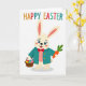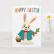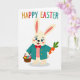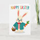 This card features a friendly long-eared bunny 🐰 centered on a plain white background, drawn with a soft cream coat and tall ears lined in pink. Its wide blue eyes and rosy cheeks pair with a big smile, giving it the kind of welcoming look you’d share with a close friend. The bunny wears a teal jacket with small gold buttons over a pink shirt, finished with a neat red bow tie that adds a dressed-up, date-ready touch. In one paw, it holds a small woven basket filled with glossy egg shapes in red, yellow, green, blue, and pink, like a shared treat waiting to be discovered together 🌷. In the other paw, it presents an orange carrot with a leafy green top, angled forward as if offering it to someone just outside the frame. Above the character, the words “HAPPY EASTER” sit near the top in multicolored lettering, standing out clearly against the white space. The basket is tucked slightly to one side while the carrot points outward, and the jacket’s gold buttons catch the light in tiny dots.