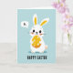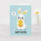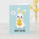 This card shows a chubby cartoon bunny 🐰 centered on a muted sky-blue background, facing forward with big dark eyes and a gentle blush that makes it look like it’s greeting a close friend. Its tall ears stand upright with golden-yellow inner fur, adding a sunny contrast to the cool backdrop. The bunny holds a large yellow egg against its chest, like a careful hug you’d give to someone you care about. The egg is decorated with scattered white spots and soft orange bands, giving it a festive, springtime look 🌷. Near the upper left, a white speech bubble contains the small text “Hi..” in dark lettering, angled as if it’s coming from the bunny’s mouth. Below the character, a thick sans-serif message line sits centered in a dark color, grounding the design with a clear greeting. A tiny fluffy tail tuft peeks out near the lower right of the bunny’s body, while the egg’s orange bands curve smoothly across its front.