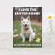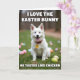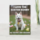 This card features a fluffy white dog sitting on green grass, its bright coat catching soft daylight and drawing your eye right away. The dog’s wide dark eyes and open-mouthed grin feel like a friendly invitation, as if it’s sharing a private joke with someone just off camera. A red collar with a small yellow round tag adds a strong pop of color against the snowy fur. Scattered around the lawn are pastel egg-shaped decorations in pink, blue, yellow, and lavender, slightly blurred to give the scene depth and a springtime mood 🌷. Near the top, a line of white text is centered and talks about liking a classic spring bunny 🐰. Near the bottom, a second line of white text is centered too, delivering a dry, unexpected comment about how that bunny might taste. The eggs sit across the foreground and mid-ground like soft confetti, with the green grass filling the background behind the smiling dog.