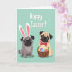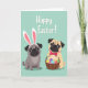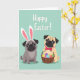 This greeting card features two sweet, stylized dogs set against a pastel mint-green background, leaning slightly toward each other with a tender, friendly closeness. Near the top, the words “Happy Easter!” sit centered in rounded white lettering that looks soft and airy. On the left, a small gray dog with a flat face and big, expressive eyes wears tall bunny ears lined in pink 🐰. On the right, a fawn-colored dog in a bright red bow tie holds a woven basket close to its chest, as if sharing it with its companion. The basket is filled with decorated egg shapes in blue, purple, yellow, and green, each marked with stripes, dots, and zigzag patterns 🌷. Simple outlines and flat color areas keep the scene crisp while letting the characters’ gentle expressions carry the warmth. The red bow tie stands out sharply against the fawn fur, and the basket’s tan weave is shaded with small curved lines.```