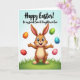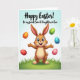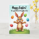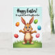 This card features a friendly, human-like bunny standing slightly below center, drawn in warm brown tones with arms open as if inviting a hug 🐰. Its big blue eyes and wide grin, along with tall ears brushed with soft pink inside, create a tender, welcoming look that feels like close friendship. Five decorated eggs float around it, each in a different color—orange, green, blue, red, and light pink—with stripes and dots that add lively detail. A fresh green patch of grass sits under its feet, sprinkled with tiny white flowers, like a quiet spot where someone might pause to share a sweet moment. Behind everything, the background fades from sky blue at the top into green near the bottom, keeping the scene light and springlike 🌷. Near the top, a short greeting appears in flowing lettering, set in a darker shade that stands out against the pale sky. The eggs are arranged in a loose arc around the bunny, with the pink and blue ones hovering closest to its raised hands.