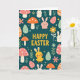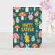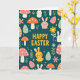 This card features a deep teal background filled with soft pastel shapes and friendly little creatures, creating a spring festival scene that feels sweet and welcoming 🌷. Near the upper center, the words “HAPPY EASTER” appear in large sunshine-yellow letters that stand out clearly against the darker backdrop. Around the text, rounded rabbits in white and blush pink face one another with gentle, close-set eyes, as if sharing a quiet, affectionate moment 🐰. A small yellow chick with rosy cheeks and open wings sits nearby, adding a lively, companionable touch as it seems to greet the bunnies. Coral and warm orange toadstools with dotted caps are scattered across the layout, balanced by mint green leaves and creamy oval egg shapes that look lightly decorated. Small floral blossoms and leafy sprigs weave between the animals and eggs, guiding your eye down the tall design like a garden path. The lettering stays centered and bright, while the surrounding elements are spaced to feel full but easy to follow, with rounded outlines and flat color fills throughout. Creamy egg ovals, dotted mushrooms, and tiny blossoms repeat across the scene in mint, coral, orange, and white against the teal field.