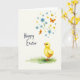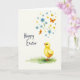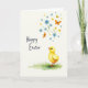 Designed with a soft watercolor look, this spring scene centers on a round little yellow chick standing on fresh green grass in the lower right, its bright eyes and tiny orange beak turned as if greeting someone nearby. Above it, a rising spray of simple stems and leaves carries sky-blue flowers with yellow centers alongside smaller golden blooms, creating a gentle upward motion 🌷. A few small winged insects in orange and yellow hover among the petals, adding a light flutter that feels like friendly company. The background stays a pale cream, letting the yellows, blues, greens, and oranges stand out without feeling busy. The chick’s calm posture and curious gaze give the scene a tender, companionable mood, like a quiet moment shared between friends 🐇. The words “Happy Easter” sit on the left side in dark lettering, spaced to balance the chick on the opposite corner. The flowers and insects cluster near the upper right, while the grass patch anchors the lower edge with soft, uneven brush textures.