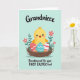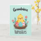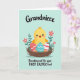 This card features a bright yellow baby bird sitting snugly in a twig-woven nest, smiling with rosy cheeks and tiny wings stretched as if reaching out for a hug. Three decorated eggs rest beside it, adding a friendly, close-together feeling like a small family gathered in one place. One egg is red with white stripes and small star shapes, another is teal with soft white wave lines, and the third is coral with a zigzag pattern. Behind the nest, green leafy sprigs and pink five-petaled flowers with white centers frame the scene like a gentle spring bouquet 🌷. The background is a smooth mint green that keeps the nest and bird front and center, while the bird’s warm expression suggests affection and a sweet bond with the little nestful around it 🐰. At the top, dark lettering in a flowing style names the recipient, and along the bottom, matching dark text announces a first Easter message. The nest sits low in the layout, with the flowers peeking up behind it and the patterned eggs clustered near the bird’s feet.