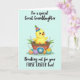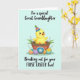 This card features a pale blue background that sets a calm spring scene, with a round yellow chick perched snugly in a reddish-brown nest at the center 🐰. The chick’s wide eyes and rosy cheeks, along with a tiny striped party hat, give it a sweet, friendly look, like it’s greeting someone it cares about. Small orange feet peek through the straw, and the nest is tucked with green sprigs and little star-shaped flowers that feel like gentle tokens of affection. Below the nest, several decorative eggs gather close together, adding a cozy, companionable touch 🐇. The eggs show soft stripes, dotted patterns, and floral details in pastel pink, lavender, teal, and touches of gold. A short greeting appears above the illustration in a dark, flowing letter style, while a second line sits below the eggs in thicker, easy-to-read lettering. The overall palette stays light and springlike, with the nest’s warm tones and the eggs’ pastel patterns standing out against the pale blue. The party hat has narrow multicolored stripes, and the eggs include tiny dots and petal shapes edged with fine golden accents.