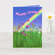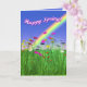 A card for spring with my digital artwork of a spring scene of fresh and pretty flowers and a rainbow in a blue sky and the text "Happy Spring".