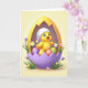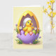 This card features a plump yellow baby chick with wide blue eyes and an open, delighted beak, giving the scene a friendly, affectionate feel like it’s greeting someone it trusts 🌷. It wears a soft white nightcap with a fluffy pom-pom, as if it has just woken up to a sweet spring morning. The chick sits snugly in a cracked golden eggshell that’s nested inside a larger broken lavender shell, creating a cozy little hideaway. Gentle light falls across its downy feathers and rounded shape, with warm yellows and oranges balanced by calm purples and fresh greens 🐰. Around the center, several decorative oval eggs are arranged with stripes, polka dots, and speckles in coordinating colors, adding a festive border. A short Easter greeting appears near the top in a light pastel tone, with a smaller line of text placed beneath it in a deeper purple for contrast. At the bottom, lilac, pink, and white blossoms rise from a green base, framing the cracked shells and patterned eggs.