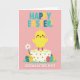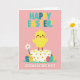 This greeting card features a bright pink background with a large yellow chick standing proudly on a white tiered cake, its rosy cheeks and open stance suggesting a friendly, affectionate welcome. Small yellow flowers and tiny red dots decorate the cake, adding a sweet, celebratory look without crowding the scene. Around the base, patterned eggs in teal, red, and golden yellow sit like little surprises, arranged in a way that feels shared between close friends. A single white daisy with a golden center rests to the left, balancing the composition with a gentle spring touch 🌷. The layout feels neatly centered, with the main character and cake stacked in the middle while the decorations mirror each other on both sides. Any greeting text would sit best near the top or bottom in simple white lettering that stands out against the pink, with small teal accents to match the eggs 🐰. The chick’s rounded shape, the crisp cake tiers, and the scattered blossoms create a tidy, graphic look, with the daisy’s petals clearly outlined beside the cake.