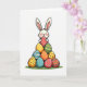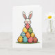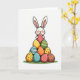 This design shows a cute long-eared bunny peeking from behind a stacked pyramid of decorated eggs, with a gentle, friendly gaze that feels like it’s meant for someone special 🐰. The bunny has tall ears with soft pink inner details, wide eyes, and rosy cheeks, adding a sweet, affectionate look to the scene. It holds a red egg with white polka dots close to its chest, like a small gift being offered. Below, ten more eggs spread out in a neat triangle, each with its own mix of stripes and dots in yellow, green, orange, blue, and red. The colors are bright and spring-like, and the patterns alternate to keep the arrangement lively without looking busy 🌷. Any greeting text sits near the top against the white background, set in a simple letter style and colored in a soft shade that doesn’t compete with the artwork. At the bottom, the eggs rest on a small green patch, with the rest of the background left plain white.