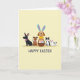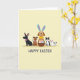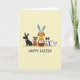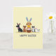 This greeting card features a row of friendly animal characters set against a soft buttery yellow background, with a gentle closeness in how they lean and glance toward one another 🌷. In the center, a medium-brown bunny-like figure with long ears shaded bright blue and pink holds a woven basket full of pastel eggs decorated with dots and stripes 🐰. To the left stands a sleek black companion with long ears lined in pink and a pink bow, turning its eyes sideways as if sharing a teasing moment with the group. Farther left, a smaller deep-brown dog sits upright, looking up with an attentive, loyal expression. On the right, a black-and-white dog with an open smile faces forward, adding balance to the lineup and a sense of shared celebration. Two tiny bunny figures in white and pale grey-blue appear near the larger animals, their small size and close spacing suggesting a cozy little circle. Below the characters, the words “HAPPY EASTER” appear centered in dark gray, placed neatly under their feet. The eggs in the basket show soft pink, blue, and yellow tones with simple stripes and polka dots.
