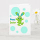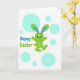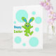 This card features a spring scene with a stylized green bunny mid-leap, its body filled with a light checkered pattern that feels cozy and friendly 🐰. Long ears stretch upward with blue and deep navy plaid panels, adding a textured contrast that draws your eye. The bunny’s wide dark eyes, small blue nose, and tiny red tongue give it an eager, affectionate look, like it’s hopping in for a quick hello or a hug. A crisp white background keeps everything airy, letting the character’s colors stand out without crowding the space. Soft aqua circles of different sizes float around like bubbles, adding a gentle, dreamy motion that suggests a shared laugh between friends 🌷. On the left side, the words “Happy Easter” appear in a rounded, easy-to-read font, set in tones that echo the greens and blues in the artwork. The text sits slightly above the bunny’s outstretched arms, balancing the layout while leaving plenty of open space. The bunny is centered with aqua circles scattered around it, and the “Happy Easter” message is placed to the left in matching cool hues.