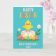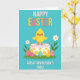 Designed with a spring celebration scene, the card centers on a plump yellow hatchling with rosy cheeks and a wide smile, wings lifted as if greeting a close friend. It stands atop a white cake that feels like a sweet little stage, trimmed with red polka dots and small yellow flower motifs. The background is a smooth teal field that makes the warm yellows pop and keeps the focus on the tender, welcoming pose 🐰. Along the bottom, a strip of green grass anchors the scene, where two simple white flowers with sunny yellow centers lean upward like they’re sharing the moment. Tucked into the grass are four decorated oval eggs, each with its own mix of stripes, dots, and color accents that suggest a fun search 🐇. A seasonal greeting appears at the top in large, shadowed letters, while a smaller line of text sits near the lower edge in a contrasting color. The cake’s border shows neat red dots and tiny yellow blossoms, with the four patterned eggs nestled in the grass below.
