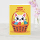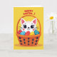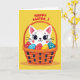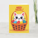 This greeting card shows a stylized cat with a friendly face and big dark eyes, peeking from a woven basket as if sharing a sweet moment with the viewer. Rosy cheek spots and fine lashes soften its expression, and the gentle look in its eyes suggests cozy friendship. The basket is shaded in warm oranges and browns with darker accents that hint at its braided texture, cradling several decorated eggs. The eggs are dotted with simple polka patterns in red, blue, and yellow, adding a light springtime touch 🌷. Behind everything sits a buttercup-yellow background that keeps the scene bright and sunny. Near the top, a seasonal greeting appears in red lettering, centered above the basket and easy to read. A faint shadow rests under the basket, and the cat’s forehead stripes and pink inner ears stand out against the yellow field 🐰.