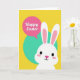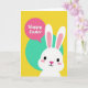 This card features a stylized white bunny peeking up from the bottom edge, set against a sunny yellow background 🐰. Its rounded black eyes, small curved smile, and soft pink blush on the cheeks and inner ears give it a gentle, friendly look, like it’s leaning in to greet someone close. The bunny’s tall ears stretch upward, adding a sweet sense of attention, as if it’s listening to a favorite person. In the upper left, a fuchsia speech bubble holds the greeting text in white, flowing lettering, like a soft note spoken aloud. That bubble overlaps a large teal circle, and the layered shapes feel like two friends sharing the same space. The simple flat colors keep the focus on the bunny’s warm expression and the bright spring palette 🌷. A teal circle sits behind the fuchsia speech bubble near the top-left corner, while the white bunny rises from the lower frame with pink-tinted ears.