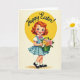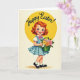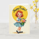 This card shows a vintage-style illustration of a smiling young girl with wide blue eyes and rosy cheeks, drawn with a gentle, friendly look that feels like she’s greeting someone she cares about. Reddish-orange curls frame her face as she stands holding a green basket brimming with spring flowers in soft pink, sunny yellow, warm orange, and crisp white 🌷. She wears a light blue dress with white polka dots over a white blouse, finished with a small pink bow that adds a sweet, affectionate touch. White socks and black Mary Jane shoes complete her outfit, giving the scene a classic, storybook feel without being too formal. Behind her sits a large yellow circle like a glowing sun, creating a warm backdrop that makes her blue dress stand out. The words “Happy Easter!” appear across the yellow circle near the top in flowing, dark lettering, clearly placed to be read at first glance 🐰. The lighting is soft and even, with the brightest area centered on the girl, her basket, and the yellow circle. The flower petals show small color shifts from pale to deeper tones, with green leaves peeking out around the rim of the basket.