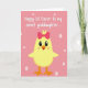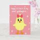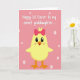This card shows a newly hatched little bird centered on the front, colored sunny yellow with orange feet and a small orange beak. A rose-pink bow sits on its head, giving it a sweet, dressed-up look, and its wide dark eyes seem to gaze forward with a tender, friendly openness. Soft blush marks on its cheeks add a gentle, affectionate touch, like it’s shyly enjoying a special day. The background is pastel pink with scattered pale pink-white dots that feel like confetti 🌷. Near the top, a line of white text is placed above the bird, set in flowing lettering that announces a spring holiday greeting for a young girl. The simple layout leaves lots of pink space around the character so your eyes go straight to its face 🐰. The pale dots vary in size and are sprinkled unevenly across the pink backdrop behind the bird.