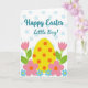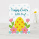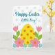 This card features a large sunny yellow egg shape in the center, dotted with small orange circles, like a shared treat set out for someone special. Around it, tall pink flower forms rise on both sides with fresh green stems and leaves, leaning inward as if in a gentle embrace. Near the bottom, small sky-blue blossoms with bright yellow centers mingle with soft pink five-petaled flowers marked by orange centers, creating a garden scene that feels friendly and close 🌷. Across the top, a white band sprinkled with light blue dots frames a short Easter greeting. The text sits near the upper middle and is written in smooth blue lettering that stands out against the pale background 🐰. The overall palette mixes soft blues, warm yellows, lively oranges, tender pinks, and spring greens for an easy, affectionate look. The background remains mostly white, letting the dotted top band and the central egg shape draw the eye. Small orange dots on the egg echo the orange flower centers below.