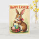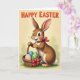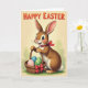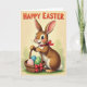 This design shows an anthropomorphic brown rabbit with a white chest and fluffy tail, looking straight ahead with wide blue eyes that feel inviting and friendly 🐰. Its tall ears have soft pink interiors, with a rosy blush on its cheeks and a bright red nose that adds a sweet, affectionate touch. A red bow at the neck gives the character a dressed-up look, like it’s ready to meet someone special. The rabbit kneels on lightly shaded green grass while holding a rustic woven basket close, as if carefully bringing a small gift. Inside are three decorated eggs: one with pink-and-white stripes, one solid blue, and one green with white polka dots, and a second red bow is tied to the basket handle 🐇. Near the top, a large seasonal greeting appears in textured orange letters, centered against a pale yellow-green background that suggests early spring. The basket sits slightly to the rabbit’s right, with the patterned eggs peeking above the rim and the grass fading softly toward the edges.