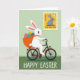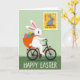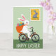 Designed with a cheerful scene, this card shows a white cartoon rabbit riding a bicycle across a pale green background with a strip of grassy ground. The rabbit’s rosy cheeks and closed-eye smile suggest a sweet, affectionate mood, like it’s hurrying to meet a dear friend 🐰. Strapped behind the rider is a large orange basket packed with decorated eggs in stripes, dots, and tiny speckles, creating a lively mix of patterns. The bicycle repeats the orange accents on the fenders and handlebars, tying the colors together with the basket. In the upper right corner, a postage-stamp-style box adds a little story, featuring a smaller gray rabbit on a warm yellow field, as if sending a friendly nod from afar 🐇. Near the bottom, a short message appears in large white letters, centered and easy to read against the green. The overall look has a lightly textured, paper-like finish, with the stamp outline and egg patterns drawn in simple, tidy lines. The orange basket sits high over the back wheel, and the stamp panel is framed with small perforation-like marks.