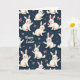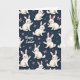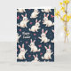 This card features a repeating pattern of soft white bunny figures with bright blue eyes and gentle pink touches on their noses and inner ears, set against a deep navy background 🐰. Each bunny strikes a different pose—one reaches a paw forward as if inviting a friend closer, while another tilts its head with a tender, curious look 🐇. Their rounded tails and fuzzy coats are shaded to look plush, with light shadows underneath that make them appear to hover slightly. Small pink bows are scattered between the bunnies, adding little hints of sweet, affectionate charm. Tiny dots in pale pink and muted gray float around like confetti, filling the space without crowding it. In the center, the words “Happy Easter” sit prominently in smooth, flowing white lettering. The text is placed over the patterned field so it stays readable while still blending into the overall design. The navy backdrop stays consistent throughout, with pink bows and speckled dots sprinkled evenly around the bunnies.