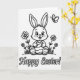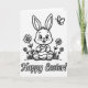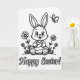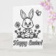 This card features a black-and-white line drawing of a friendly cartoon rabbit 🐰 sitting in a small patch of young grass, with big bright eyes and an open smile that feels like it’s meant for someone close. Light gray shading on its cheeks gives it a soft blush, like it’s sharing a sweet moment with a friend right in front of it. The rabbit holds a decorated egg carefully in its paws, as if offering it with gentle attention rather than just showing it off. On both sides, simple flower clusters rise from the ground, their rounded petals and stems outlined neatly to frame the scene like a garden border 🌷. Near the upper right corner, a small winged insect hovers, adding a quiet bit of motion above the rabbit’s ears. Along the bottom, the words “Happy Easter!” are centered in dark lettering, standing out clearly beneath the picture. A tiny heart shape appears on one of the rabbit’s footpads, drawn as a small detail near the lower part of the figure.