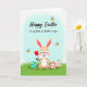 This card shows a peach-toned bunny 🐰 with big upright ears, rosy cheeks, and a wide open smile at the center, holding a single red tulip close as if offering it to someone special. A soft green grassy area stretches along the bottom, setting a gentle spring scene that feels friendly and a little romantic through the bunny’s tender, giving pose. Resting on the grass are three decorated egg shapes: one with blue and yellow stripes, one white with red dots, and one with fine brown geometric markings. Near the top, the words “Happy Easter” appear in flowing dark lettering against a pale blue sky that fades lighter toward the horizon. Just below that, a smaller line of message text sits in a simpler style, kept neatly centered and easy to read. Three tiny winged insects with striped bodies drift across the upper sky, adding light motion 🌷. The sky is a smooth gradient from soft blue to near-white, with the insects spaced in a loose row above the bunny’s ears.