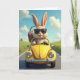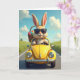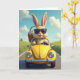 This greeting card features a friendly, humanlike rabbit with soft light-brown fur and long ears cruising in a sunny yellow, classic compact car 🐰. The rabbit’s wide grin and dark sunglasses give it a confident, flirty look, as if it’s on its way to meet someone special. A woven basket in the back seat is packed with dyed eggs in red, blue, orange, and green, like a colorful surprise meant to be shared 🌷. The car is centered and driving toward the viewer on a smooth gray road, with gentle green hills rolling away on both sides. Up top, the greeting text sits near the upper edge in a warm spring color that stands out against the sky, with a smaller line of text tucked beneath it in a darker shade. Bright daylight adds soft shadows under the car and a shiny gleam along the metal trim, while the rabbit’s fur shows fine texture around the cheeks and ears. In the distance, a wide blue sky fades toward the horizon and is dotted with puffy white clouds.