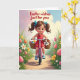 Designed with a cheerful spring scene, this Easter card features a young girl with bright eyes and rosy cheeks riding a slender pink bicycle along a sunlit dirt path. Her brown hair is styled in pigtails tied with two big blue bows, and she wears a red sleeveless outfit that stands out against the garden greens. Two wicker baskets hang from the handlebars, one filled with decorated eggs and the other holding a small brown-and-white puppy in a blue neckerchief, leaning close as if enjoying the ride together 🐰. Around them, green grass and tiny white-and-yellow flowers line the path, while oversized patterned eggs in pinks and oranges rise on thin stems like garden blooms 🌷. A simple Easter greeting sits near the top in a soft, light-colored font, with smaller text tucked neatly near the bottom in a matching shade. The sky shifts from gentle lavender on the left to clear blue on the right, dotted with a few pale clouds. Oversized eggs with polka dots and stripes appear among the flowers in pink, orange, and peach tones.