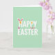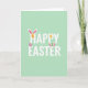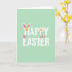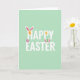 Designed with a soft pastel green background, this card sets a springtime scene that feels light and airy 🌷. Centered across the front, a well-wishing phrase appears in crisp white sans-serif lettering, with the words spaced to feel open and easy to read. Tucked into the text, patterned egg shapes and bunny ears replace or frame a few letters, like little surprises shared between close friends 🐰. One striped yellow-orange egg sits snugly between white ears with pink inner details, adding a tender, cuddly touch to the message. Another set of ears peeks around a teal egg dotted with small spots, as if the design is quietly waving hello. Nearby, a pink-and-white striped egg and a speckled golden-yellow egg are scattered around the wording to balance the layout. The white text stays dominant in the middle while the colorful accents sit around it like small decorations. The final detail is a pair of white bunny ears with pink interiors cradling a striped yellow-orange egg within the lettering.