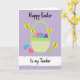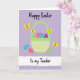 This design shows a light green basket with horizontal stripes and a gently arched handle, set against a soft lavender background 🌷. Inside the basket, oval seasonal tokens in coral, teal, sage, and deep purple sit close together like friends leaning in, each decorated with tiny crosses, dots, and hearts. A few of the ovals tumble out and rest below the basket, creating a casual, shared-moment feel, like someone just set them down for another person to find 🐰. Four small yellow winged insects hover above with antennae raised, circling the basket as if drawn to the sweet scene. The words “Happy Easter” appear near the top in black, loose hand-drawn lettering, standing out clearly on the lavender field. Along the bottom, a wide white textured band stretches across the card with “to my Teacher” written in black and centered within it. The lower band looks slightly grainy, like brushed paper, with the basket and scattered ovals sitting just above its edge.