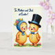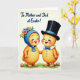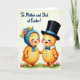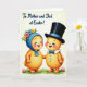 This card shows two chubby, human-like rabbits in a soft orange-yellow standing close together on spring grass 🐰. One wears a bright blue bonnet tied under the chin, topped with small pink, yellow, and blue flowers, while the other sports a black top hat with a thin blue band, a white collar, and a blue bow tie with three tiny buttons. Their eyes are closed in matching grins, with rosy mouths and blush-pink cheeks, and one gently rests a hand on the other’s arm, like a quiet sign of closeness. Behind them, fluffy golden-orange tails peek out, adding a cozy touch to their cuddled-together pose. The background is a creamy ivory that keeps the focus on the pair and the fresh green ground beneath their feet 🌷. Near the top, dark blue lettering reads “To Mother and Dad at Easter!” centered above the characters. Two pastel pink egg-shaped ornaments sit on the grass, one on each side of the rabbits.
