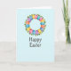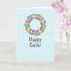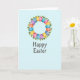 This greeting card features a circular wreath of watercolor-style eggs and leafy greenery centered on a smooth, light blue background, with a soft spring feel 🌷. The eggs are painted in gentle shades of pink, blue, purple, orange, and yellow, arranged close together like a friendly gathering. Small green leaves and curling tendrils weave between them, creating the look of an affectionate embrace around the circle 🐰. The lighting stays even and airy, so the colors look softly luminous without strong shadows. Beneath the wreath, the words “Happy Easter” sit centered in a dark gray, simple sans-serif font. The text is placed with generous space around it, keeping the layout calm and easy to read against the pale blue field. Subtle watercolor texture shows through each egg and leaf, with faint brush marks and light-to-dark washes visible along their edges.