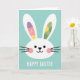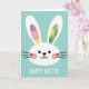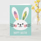 Designed with a sweet spring look, this card features a rounded white bunny face centered on a soft pastel teal background 🐰. Fine diagonal lines lightly texture the backdrop, giving it a gentle sense of depth while keeping the scene calm and open. The bunny’s small dark eyes and simple curved smile sit above rosy pink cheeks, and thin black whiskers stretch outward like a quiet hello. The long ears rise tall and slightly apart, creating a tender, friendly openness that feels like an invitation to come closer 🌷. Inside the left ear, a soft lavender section sits beside pale yellow, both dotted with thin white marks that look like little breezes. Inside the right ear, light green is sprinkled with yellow and deeper green dots, again accented with those airy white strokes. Beneath the bunny, a short message appears in thick white letters, centered near the bottom against the teal field, while the ear patterns stay asymmetrical and eye-catching.