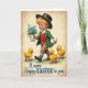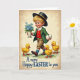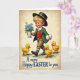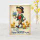 This card shows a young boy with golden hair peeking from under a tall black top hat with a thin gold band, stepping forward with an open-mouthed grin that feels like he’s hurrying to meet a friend. He wears a green jacket over a red vest, tan knee-length pants, and bright blue socks, giving the scene a dressed-up springtime look. In his left hand he holds a small white vase filled with soft blue flowers 🌷, angled as if he’s offering them to someone just out of view. In his right hand he carries two smooth egg shapes, tucked close like a shared treat meant for two. Three fluffy yellow chicks with orange beaks trail behind him in a tight little line, their close following echoing the boy’s eager, affectionate energy 🐇. The ground is a textured patch of green grass, while the background is a muted, parchment-like beige with a lightly worn, vintage-style finish. A short holiday greeting sits centered along the bottom in dark lettering, and the final touch is the fine feathering on each chick and the tiny highlights on the boy’s hat band.