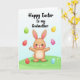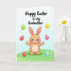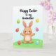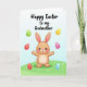 This card shows a friendly, cartoon-style rabbit standing front and center in a spring scene 🐰. The rabbit has soft brown fur, an ivory belly, pink inner ears, and rosy cheeks, with open arms that read like an eager hug meant for a close friend. Around it, several decorated egg shapes in green, yellow, pink, red, and blue drift in the air, each marked with thin white stripes, while one rests on the grass as if just set down for someone special 🌷. The background fades from a pale blue sky into gently rolling light-green hills, keeping the setting airy and calm. Near the top, a seasonal greeting is placed in dark lettering that stands out clearly against the sky. Subtle shading gives the rabbit’s face and belly a soft, rounded look, and the eggs have a slight highlight that makes them seem glossy. The scene includes a small fluffy tail and a patch of bright green ground beneath the rabbit, with the floating eggs spaced around its head and shoulders.