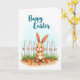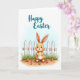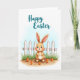 The front design shows an upright long-eared bunny 🐰 in soft brown and cream, with rosy cheeks and wide, friendly eyes that seem to invite a gentle, shared moment. Behind the bunny, a white picket fence stretches straight across the scene, giving the background a neat, cozy garden feel. At the base of the fence, fresh green grass fills the lower area, and a few colorful root vegetables sit in the earthy foreground like a small gift gathered for a friend. The sky fades from pale blue at the top into white, keeping the scene light and airy. Near the upper center, a festive message appears in flowing teal lettering, standing out clearly against the light sky. The bunny’s relaxed posture and soft gaze suggest a tender closeness, like it’s waiting to greet someone special 🌷. Bright orange carrots and leafy greens cluster near the bottom edge in front of the fence.