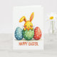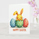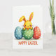 This design shows a bright yellow, long-eared bunny peeking out from a green egg shell with light polka dots, its wide eyes and rosy cheeks giving it a sweet, friendly look 🐰. The bunny’s small paws rest on the cracked edge, as if it’s leaning forward to greet someone it cares about. On the left sits an oversized speckled egg in soft blue, and on the right a matching speckled egg in warm red, creating a balanced trio on a white background. Gentle, diffused lighting softens the rounded shapes so everything looks calm and tender rather than dramatic. The mix of sunny yellow, leafy green, cool blue, and warm red keeps the scene lively while still feeling cozy, like a shared spring moment between close friends. Near the bottom, the words “HAPPY EASTER” appear in orange, set in thick, easy-to-read letters centered beneath the illustration 🌷. Fine watercolor-like texture is visible across the eggs and the bunny, especially along the speckles and the jagged cracks of the shells.