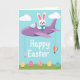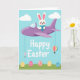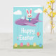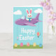 This card shows a pastel spring scene where a friendly bunny 🐰 with long ears and rosy cheeks flies a small lavender airplane across a calm blue sky, wearing a neat blue scarf as if heading to meet someone special. The bunny’s forward-leaning pose and bright eyes suggest an eager, affectionate dash through the air, like delivering a sweet surprise to a close friend. Puffy white clouds float around the plane, and thin strings hang from the wings holding tiny striped hot-air balloons in soft pink, yellow, and light blue, like little gifts drifting along. Along the bottom edge, a band of green, spiky grass grounds the picture and adds a fresh outdoor feel 🌷. Resting on the grass are five decorated eggs, each with its own pattern—zigzags, dots, stripes, and small hearts—in gentle pastel colors. Near the center of the sky, a spring greeting appears in large white lettering, placed prominently so it stands out against the blue background. The airplane sits slightly above the text, and the dangling balloons trail behind it in a loose arc over the eggs. The lavender plane, blue scarf, and pastel balloons contrast softly with the cerulean sky and the row of patterned eggs below.
